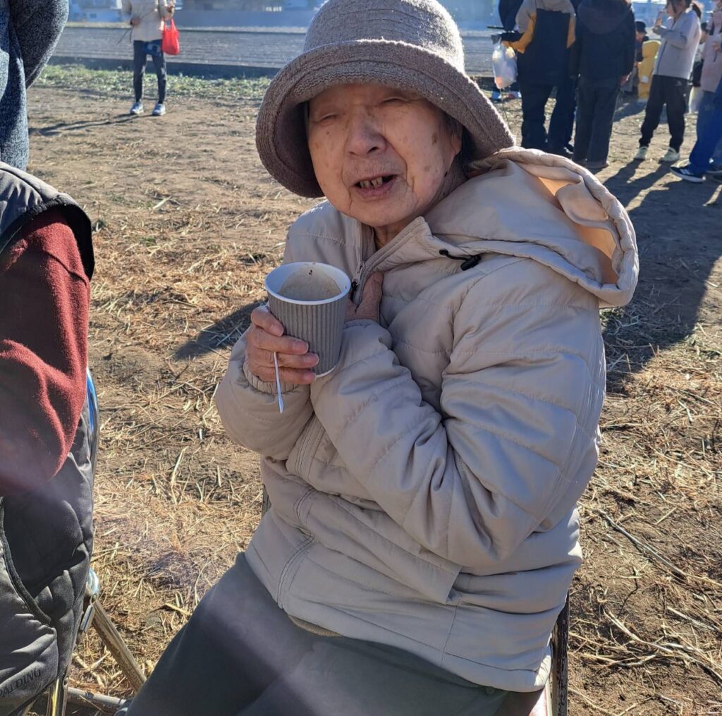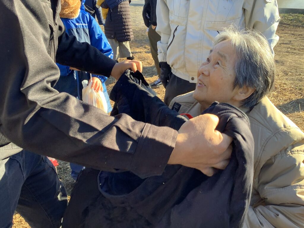 厚着をして出かけたものの、利用者さんからは「寒いね」「寒いね」との声が聞かれました。すると、近くにいらした地域の方がその様子に気づき、ご自分の上着を貸してくださいました。その優しい心遣いに、気持ちが温かくなりました。