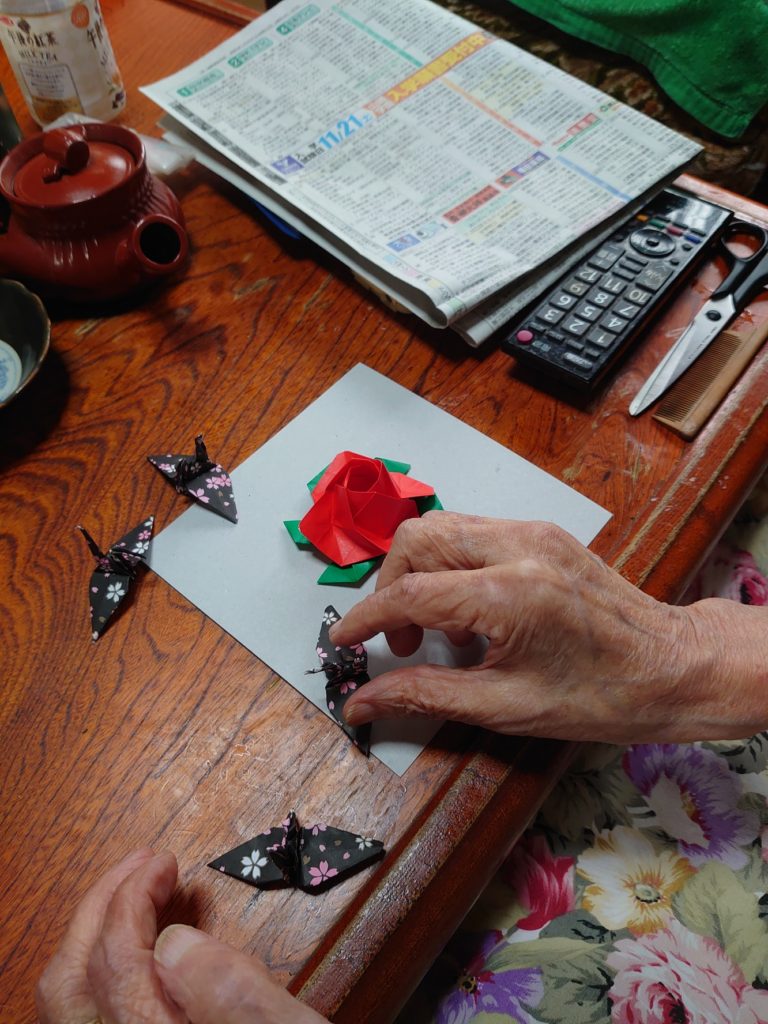 今日は何をつくって見せよう(定期巡回ブログ) 2020年11月9日 ブログ 定期巡回随時対応型訪問介護看護 おりがみでバラと鶴を作られ、台紙にどう貼るか思案中…。いつもおしゃれなかわいい物を作って、訪問する職員を待ってくれています。私たちを喜ばせたい気持ちに感謝です!! タグ : 定期巡回随時対応型居宅介護, 待っていてくれる人がいる, 折り紙, 誰かに会える 「ぐんまウエブマラソン完走(小多機ブログ)」 「「100歳まで走り続ける。死ぬまで走り続ける。」(小多機ブログ)」