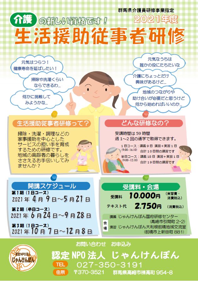 生活援助従事者研修(資格取得講座)のR3年度受講募集を開始しました。 2021年3月22日 受講募集 イベント告知/求人など ページ更新の情報 詳細はこちらをクリック タグ : ボランティア, 介護, 前橋市, 無資格者, 生活援助従事者研修, 群馬県, 資格取得, 高崎市 「介護職員初任者研修(資格取得講座)のR3年度受講募集を開始しました。」 「い~ねくらぶ園だより3月コラム「異年齢保育 で育まれるもの」」