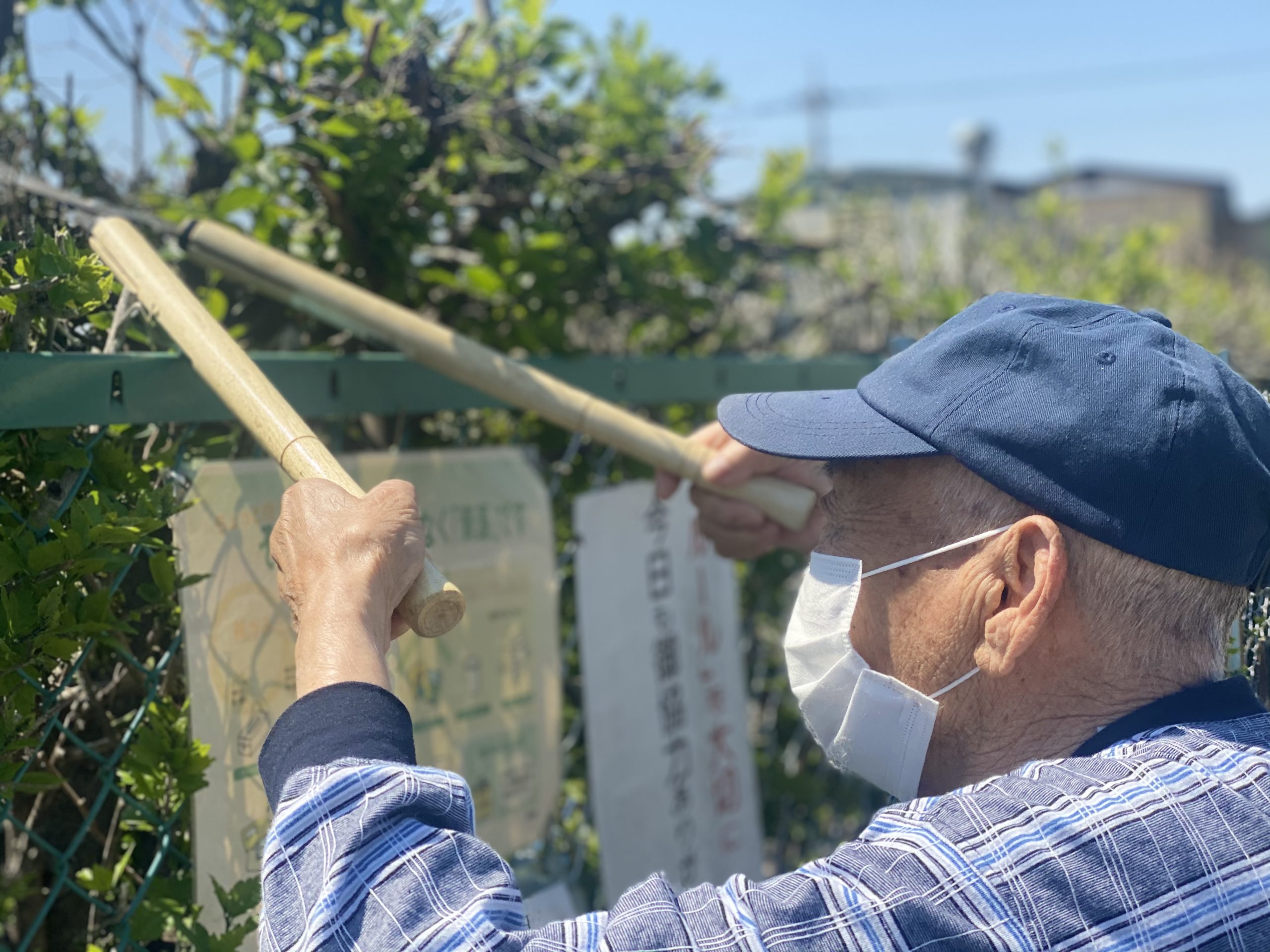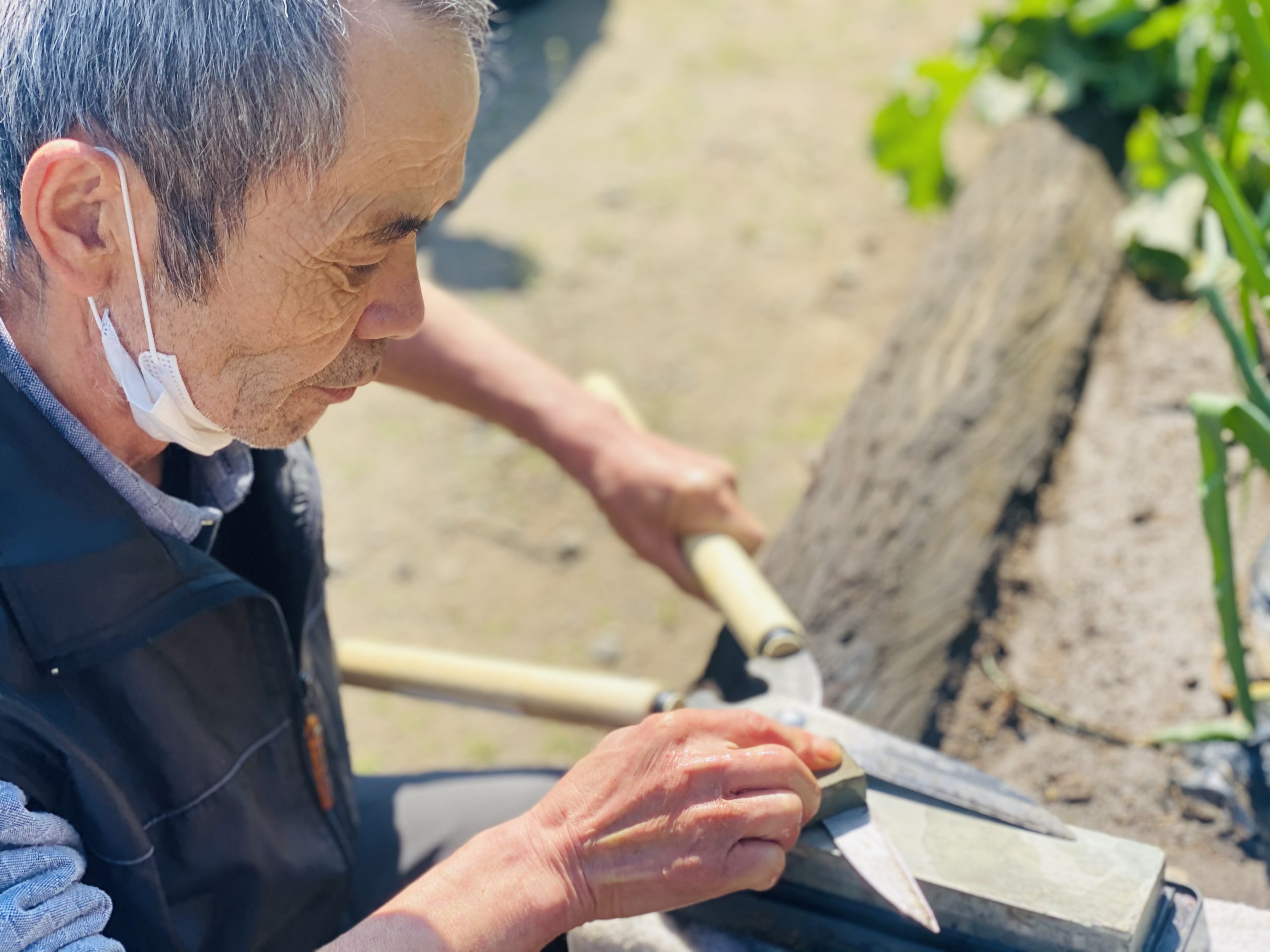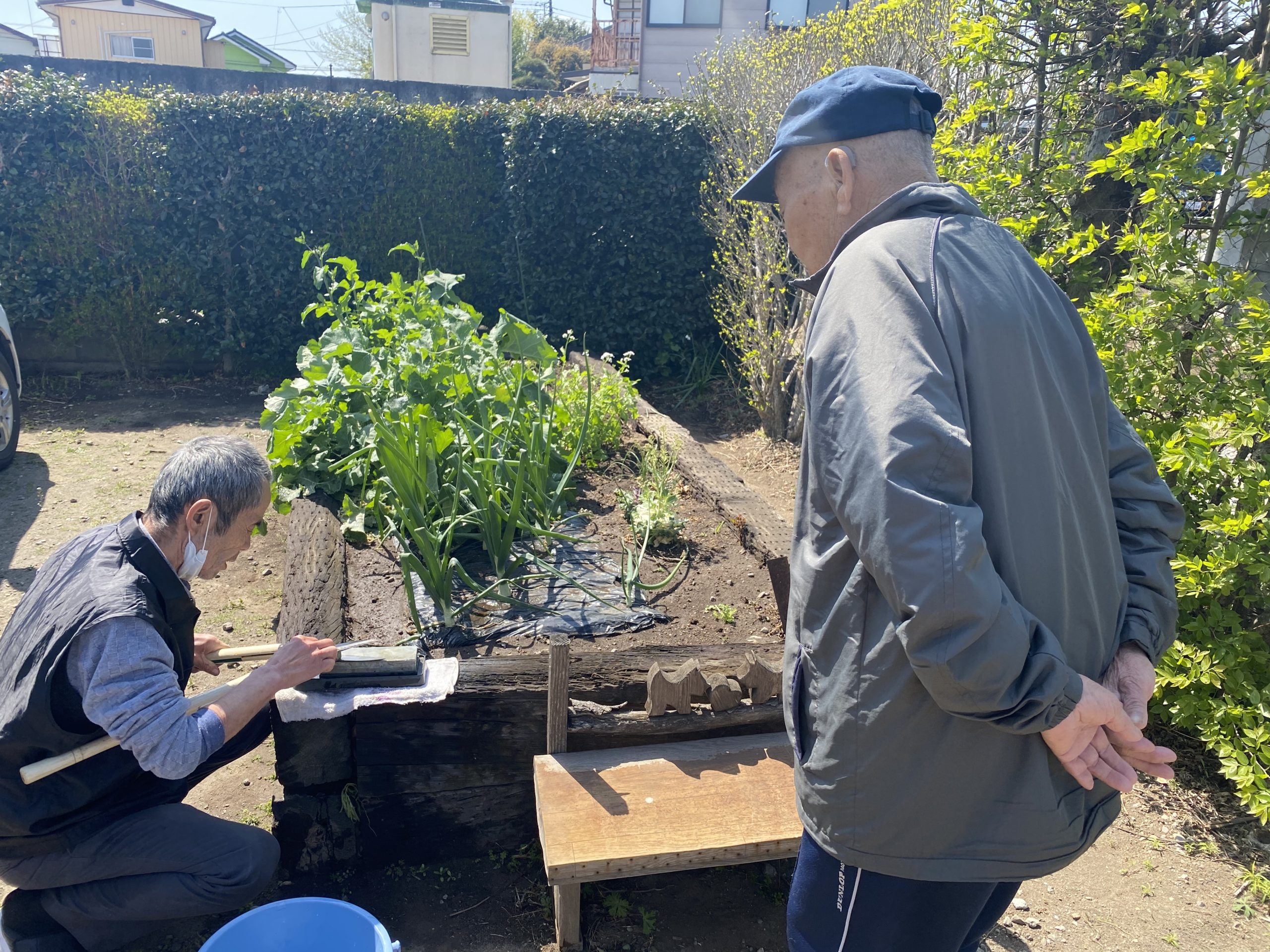 庭の手入れがお好きなご利用者が「剪定ばさみがよく切れない」と話すと、別の方が「俺が研いでやるよ」と協力して下さりました。