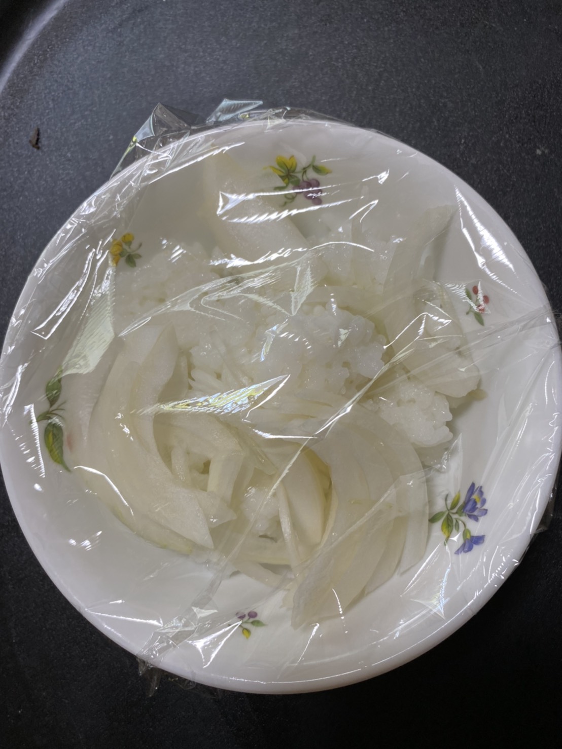 スライスした玉ねぎをご飯の上に乗せ、レトルトカレーを温めてかけるのだそうです!