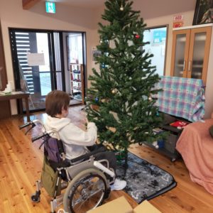 看護小規模多機能の利用者さんが地域支え合いセンターの大きなクリスマスツリーの飾りつけを手伝ってくださりました🎄✨
