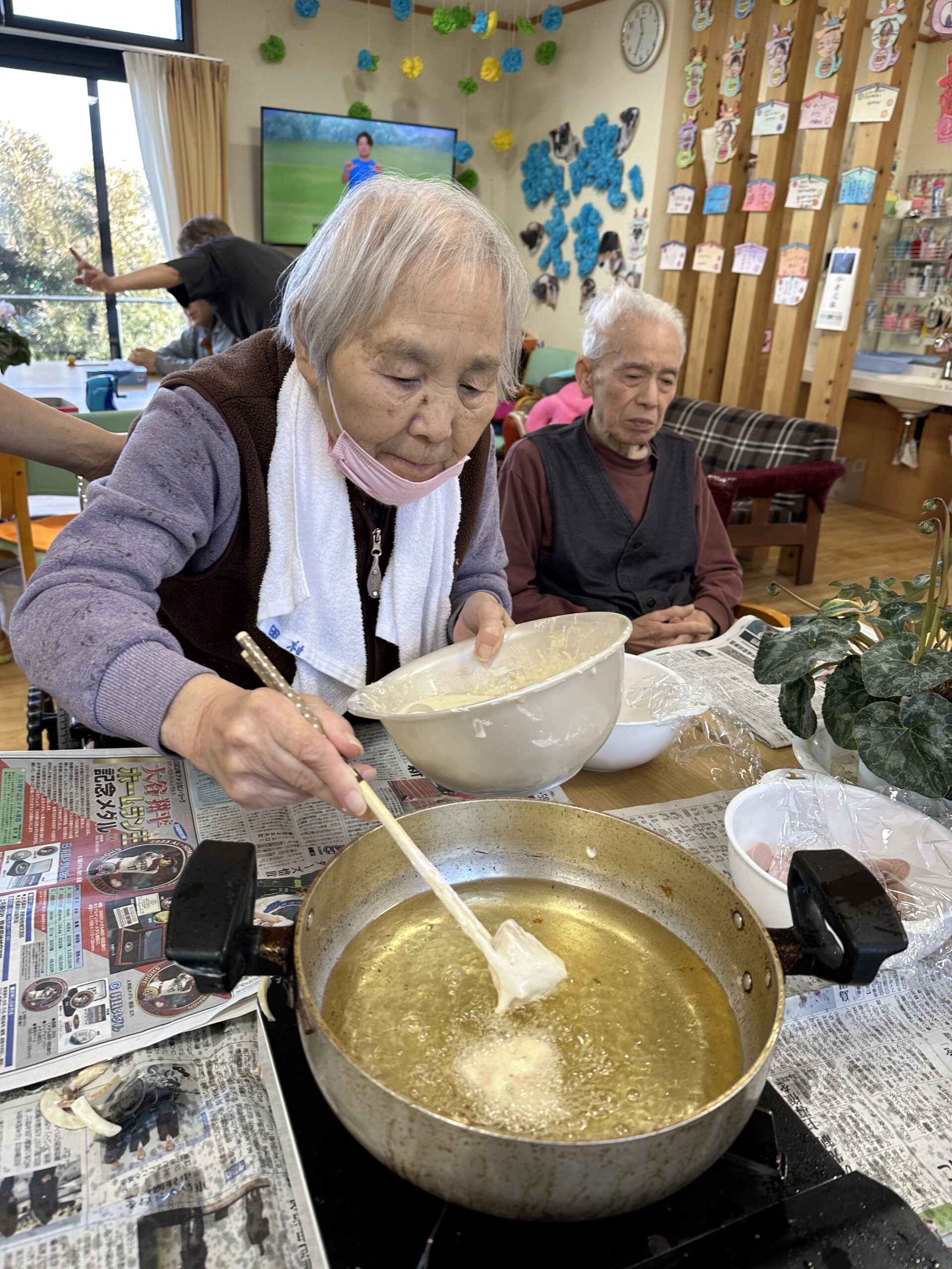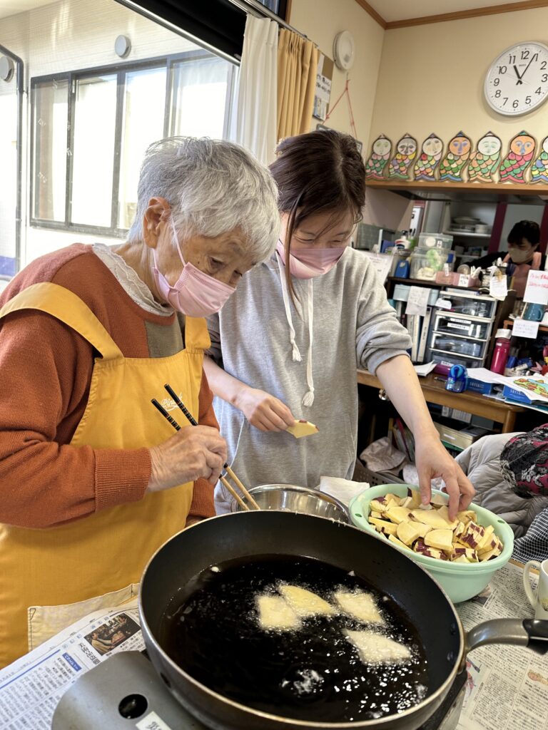 地域の方に頂いた甘くて美味しいサツマイモをテキパキと揚げる利用者さん。