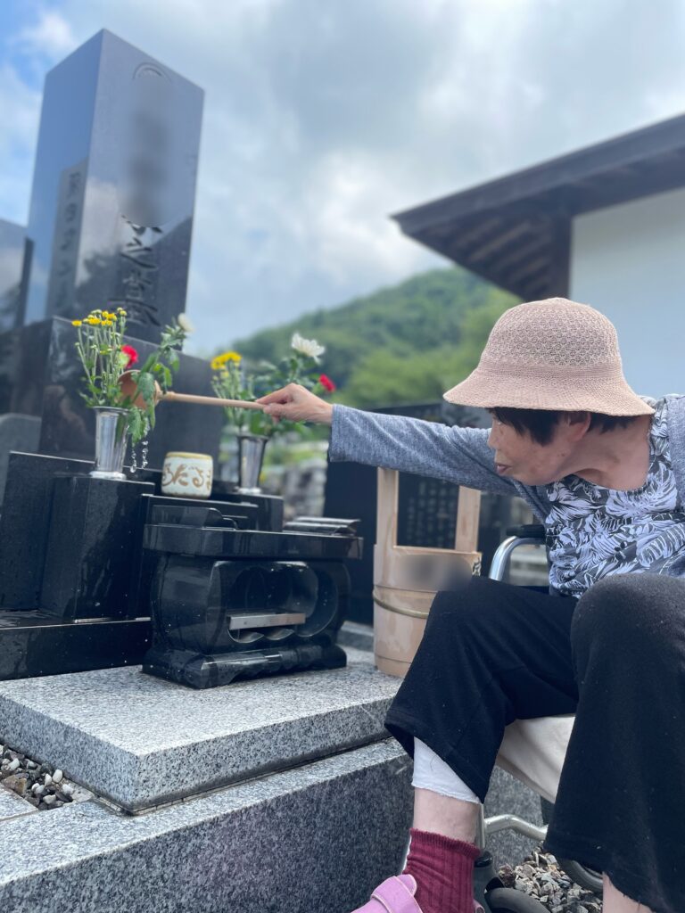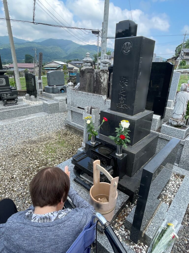 お墓参りへ(グループホーム あいあいえす) 公開日 : 2024年8月27日 / 更新日 : 2024年9月27日 グループホーム、認知症デイ ブログ 「お墓参り連れてってくれる?」とご先祖様の供養を大切にされている利用者さん。今回のお盆にもお墓参りへ行ってきました。お花を生け、お線香をあげ、しっかりと手を合わせていました。お墓参りの後はご希望のあったお店で外食。大好きなお寿司に天ぷら、お持ち帰りで天丼を選ばれホームへ戻ってこられました。今後も利用者さんそれぞれのご希望に寄り添って、支援していきたいとおもいます。 タグ : あいあいえす, お墓参り, お盆, ご先祖供養, グループホーム, 外食, 群馬, 高崎 「夏だ!スイカだ!フルーツポンチだ!【グループホーム あいあいえす)」 「かき氷を食べに(グループホーム 大利根前橋)」