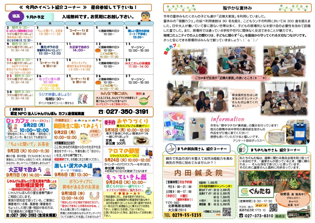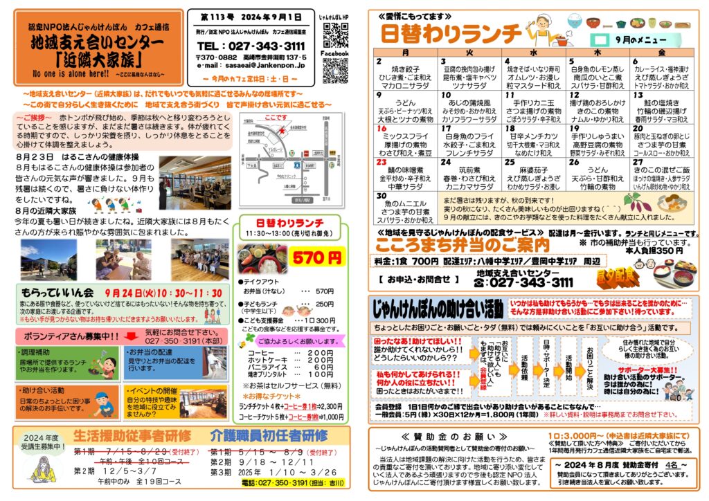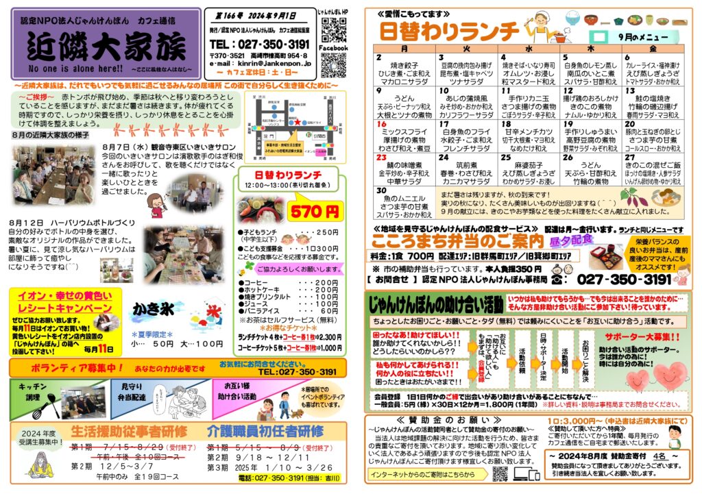コミュニティカフェ近隣大家族はみんなの居場所です。どなたでもお気軽にお立ち寄りください。居場所で活躍してくださるボランティアさんも随時募集しています。調理補助やお掃除、お弁当の配達・買い物など興味のある方はお問い合わせください。お持ちの特技を活かしてみませんか?