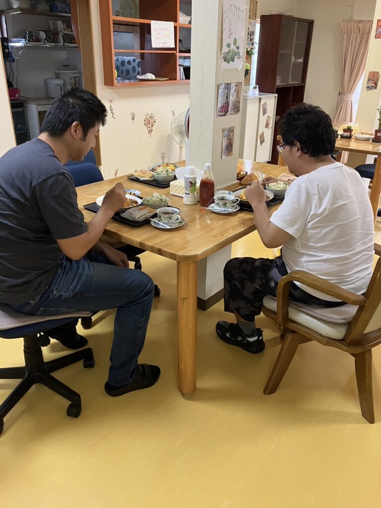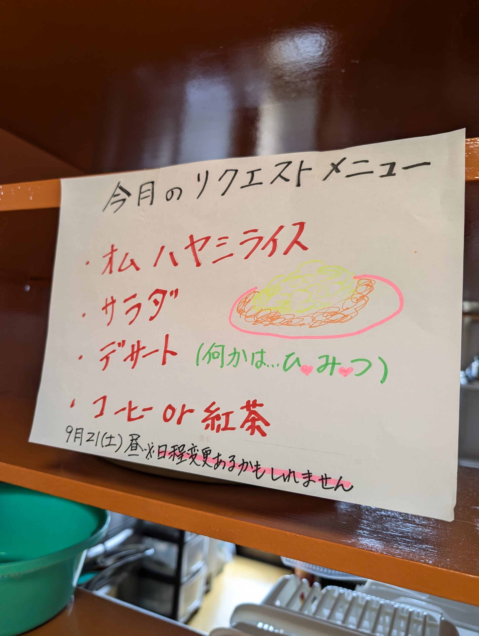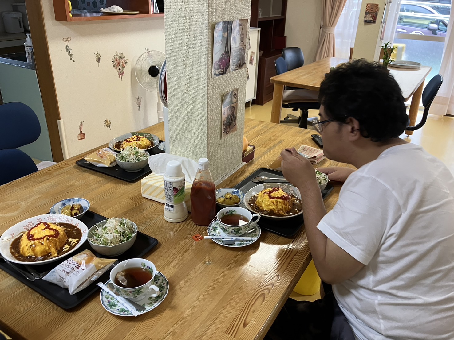 リクエストメニュー(障がい者グループホーム リビングベース) 2024年9月30日 障がい ブログ じゃんけんぽんでは2024年より、障がいのある方が外の活動から帰ってきて安心して過ごせる家『リビングベース』をスタートしています。リビングベースの食事は3食手作りです。この日はリクエストのあったオムライスでした(^-^) ※随時入居者を募集しております。お気軽にご相談ください。☎027-372-8436 タグ : グループホーム, リビングベース, 入居者募集, 共同生活援助, 地域参加, 棟高, 相談援助, 認定NPO法人じゃんけんぽん, 障がい, 障害者グループホーム, 高崎 「実習生(グループホーム あいあいえす)」 「カフェ通信 10月号」