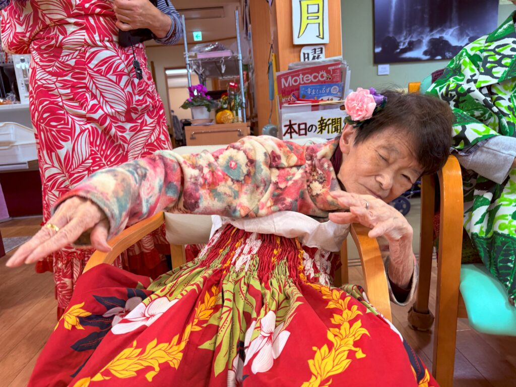 当日は衣装も貸していただき、アロハシャツやレイを身に着けホームが一気に南国ハワイの雰囲気に♪まずは挨拶から「アロ~ハ!」と楽しくスタート!