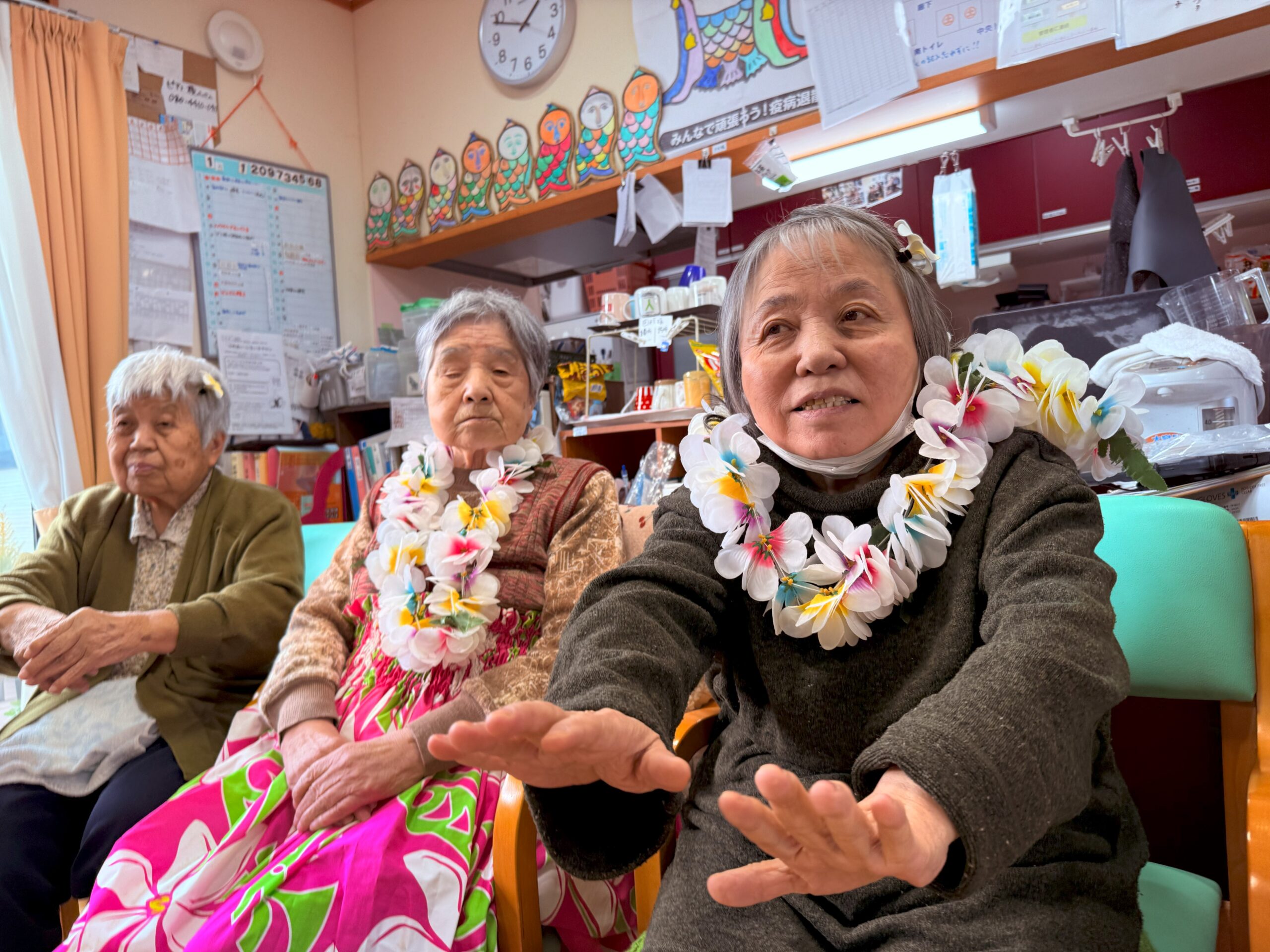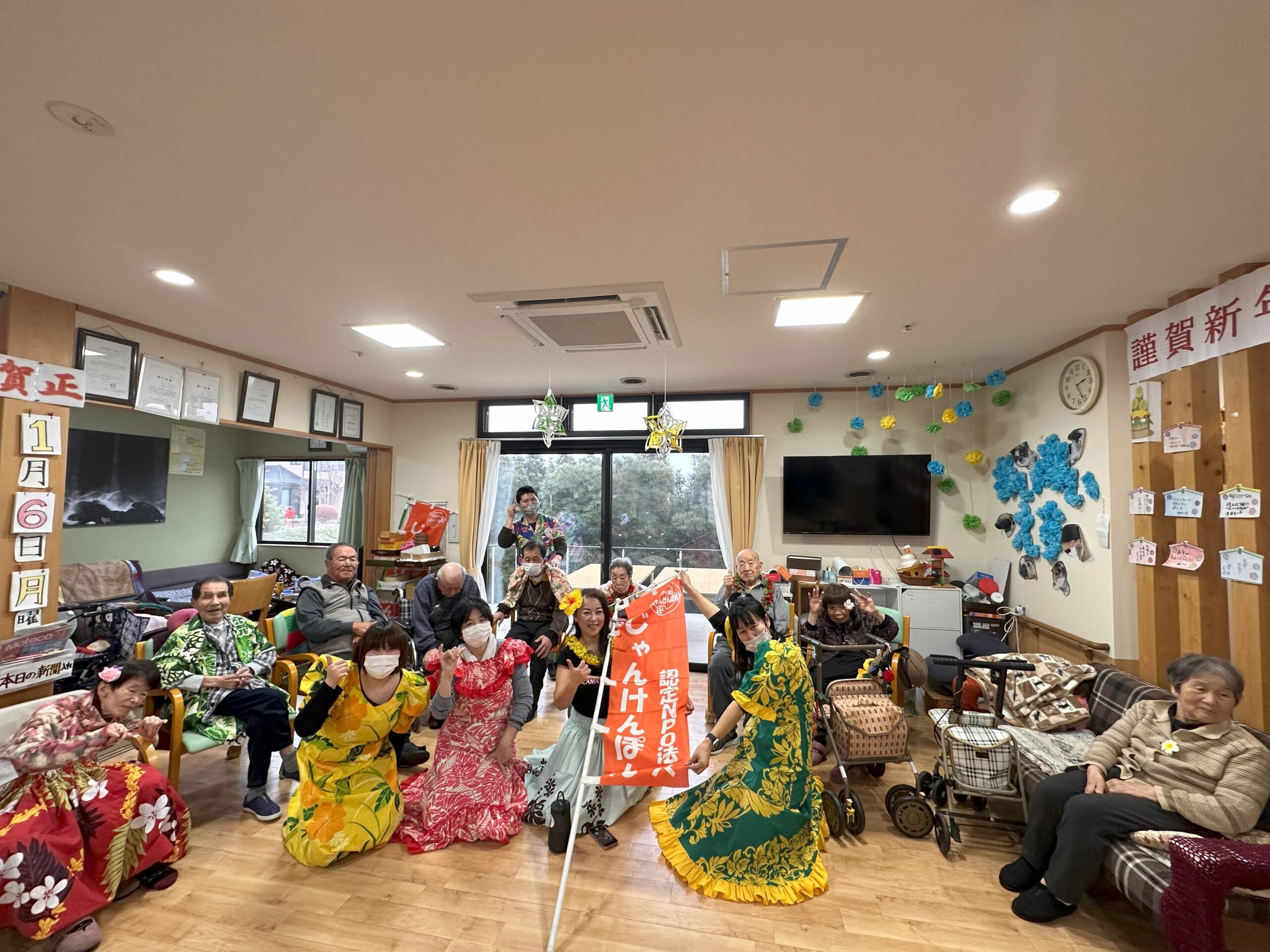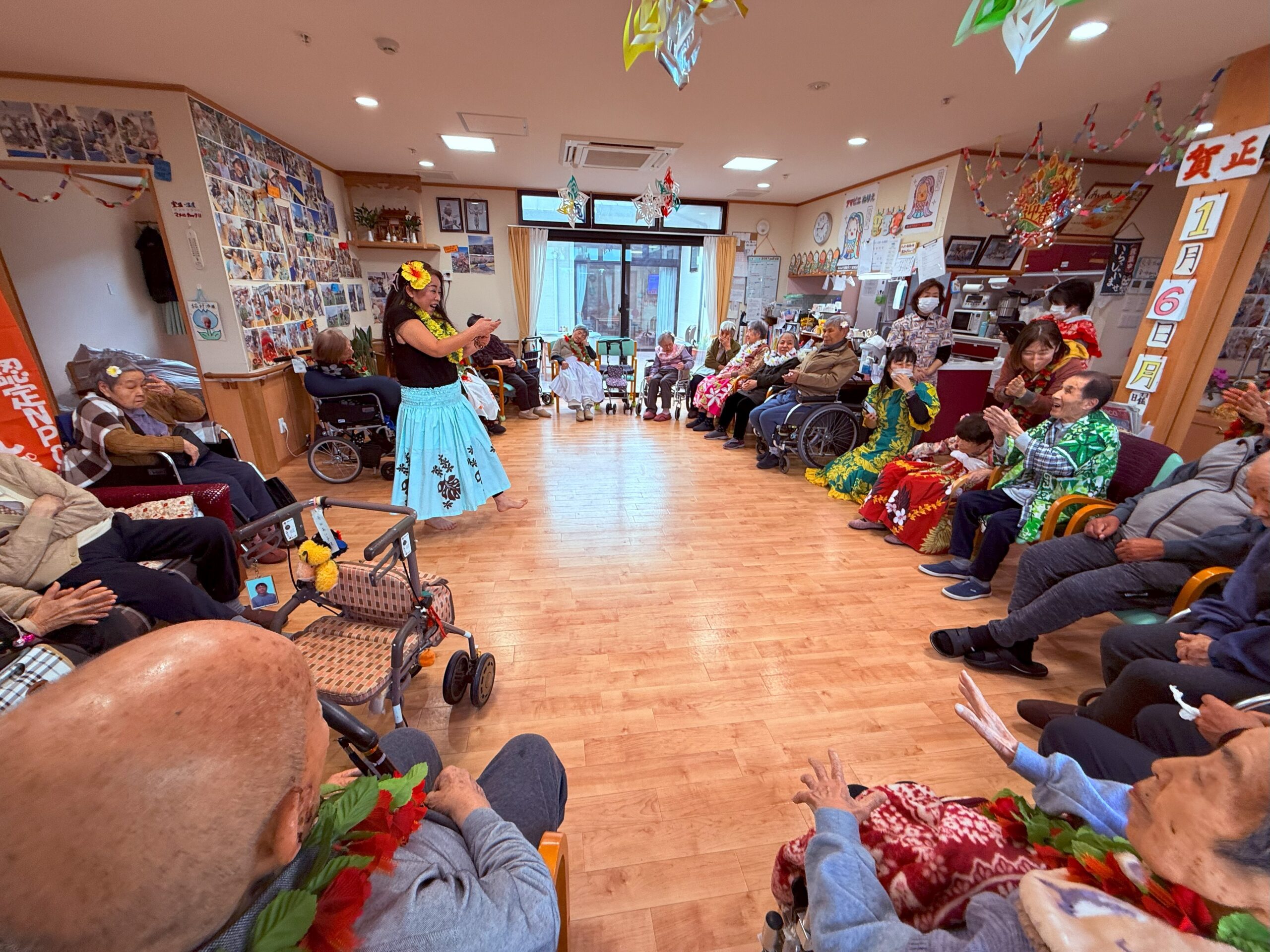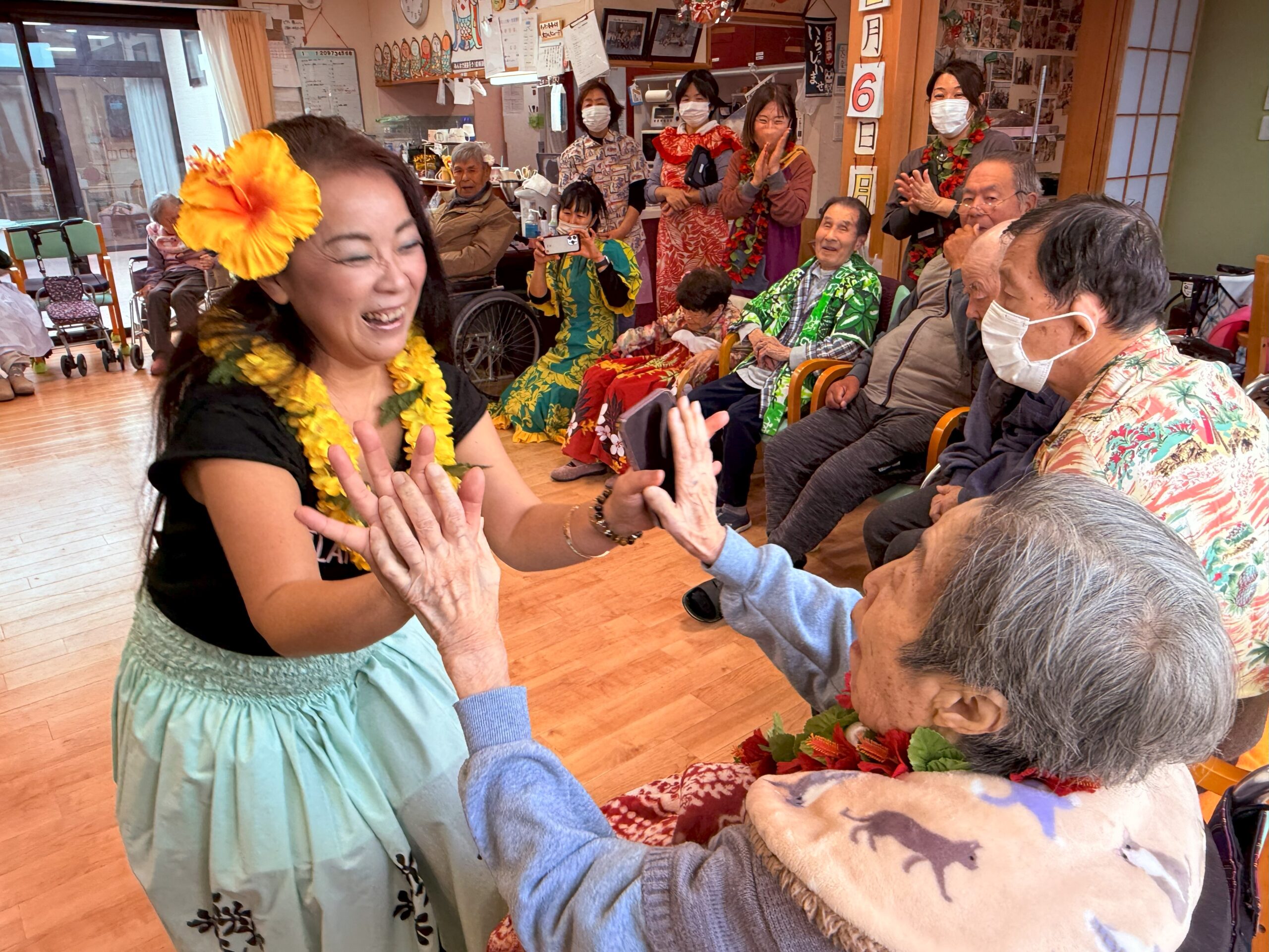 当日は衣装も貸していただき、アロハシャツやレイを身に着けホームが一気に南国ハワイの雰囲気に♪まずは挨拶から「アロ~ハ!」と楽しくスタート!