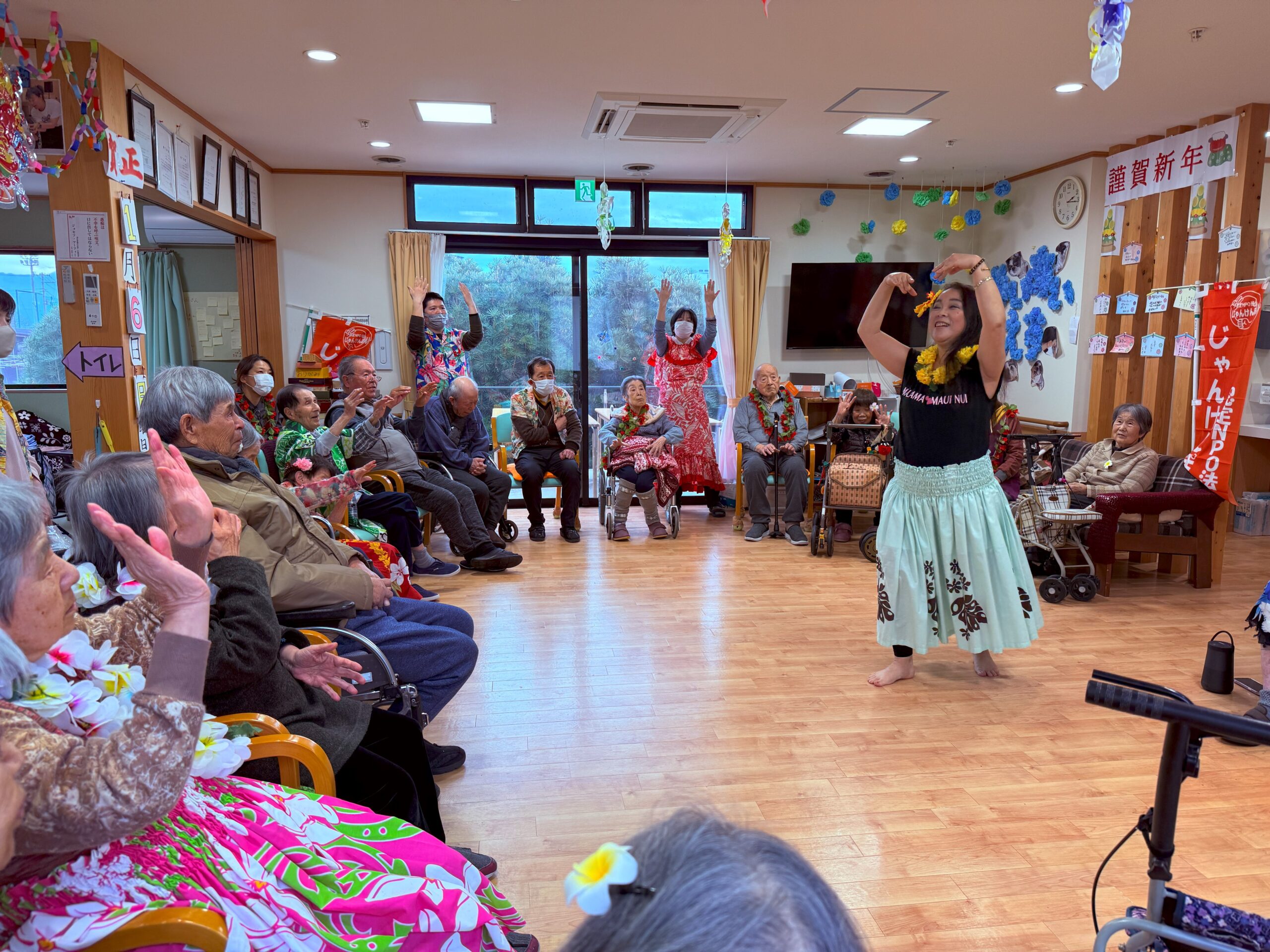 群馬町とあいあいえすの利用者さん職員30名程でフラダンスを間近で見せて頂き、『たき火』の振り付けも教えて頂いて一緒に踊りました。