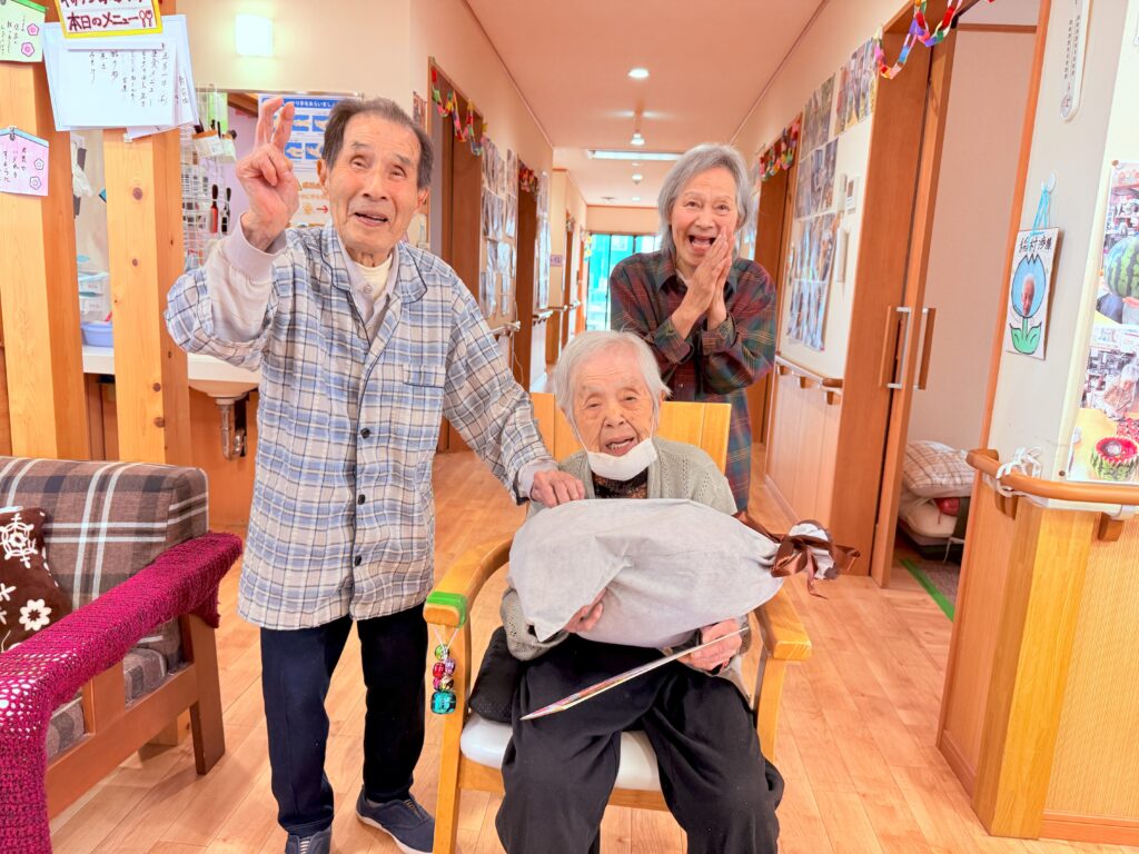 誕生日にお出かけ(グループホーム あいあいえす) 2025年5月14日 グループホーム、認知症デイ ブログ お誕生日の当日に誕生日プレゼントを買いに一緒に出かけました。普段は外出に乗り気でない方なのですが、お店につくと「これがいいんじゃない?」「あら、これがいいね」とお好みの衣類をご自分で選定しました。帰りにはご本人の好物のパンも購入。ホームにつき、おやつの時間にはお誕生者会を開催。「100歳まで頑張りまーす!」と元気よく抱負を宣言!お誕生日おめでとうございました! タグ : プレゼント, 群馬, 認定NPO, 誕生日, 高崎 「ゴーヤを植えました(近隣大家族)」 「バラ園(グループホーム あいあいえす)」
