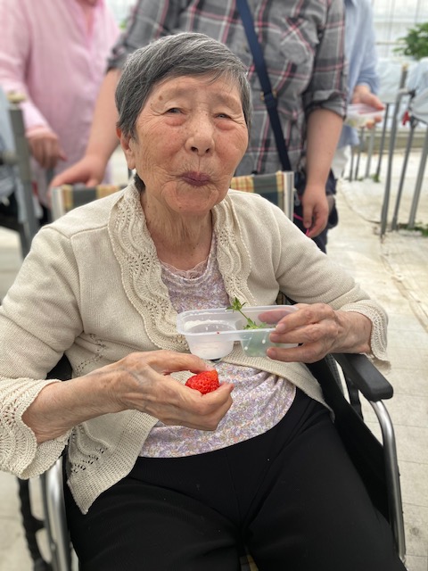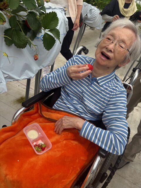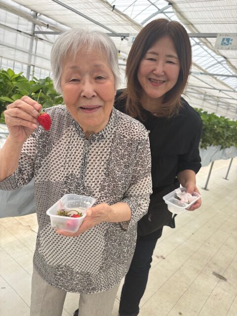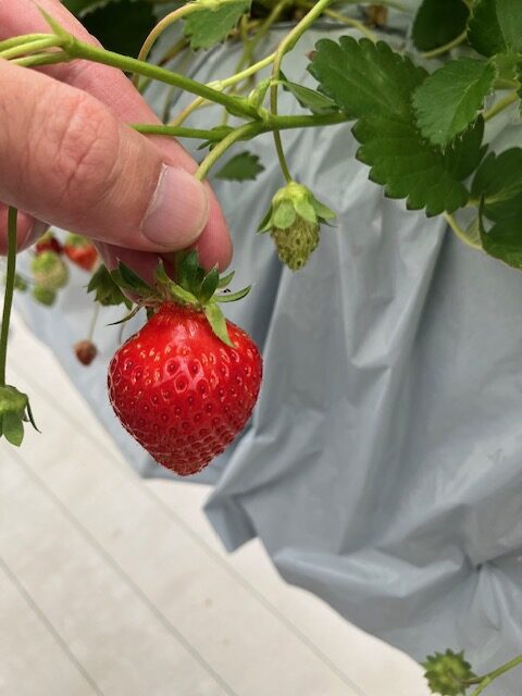 車椅子も通れるレーンがあり、いちごも取りやすい位置に実っています。いちごにも種類があり、食べ比べてみると味わいが違います。こっちのほうが甘いね、酸っぱいけど美味しいねと、わいわいがやがや話しながら食べました。