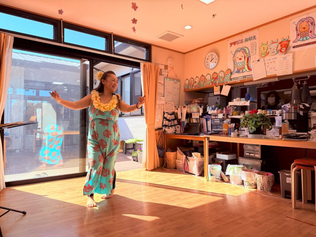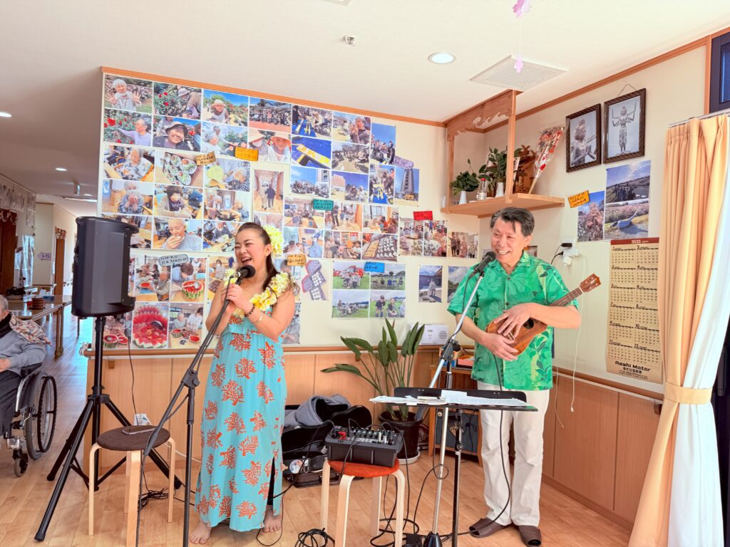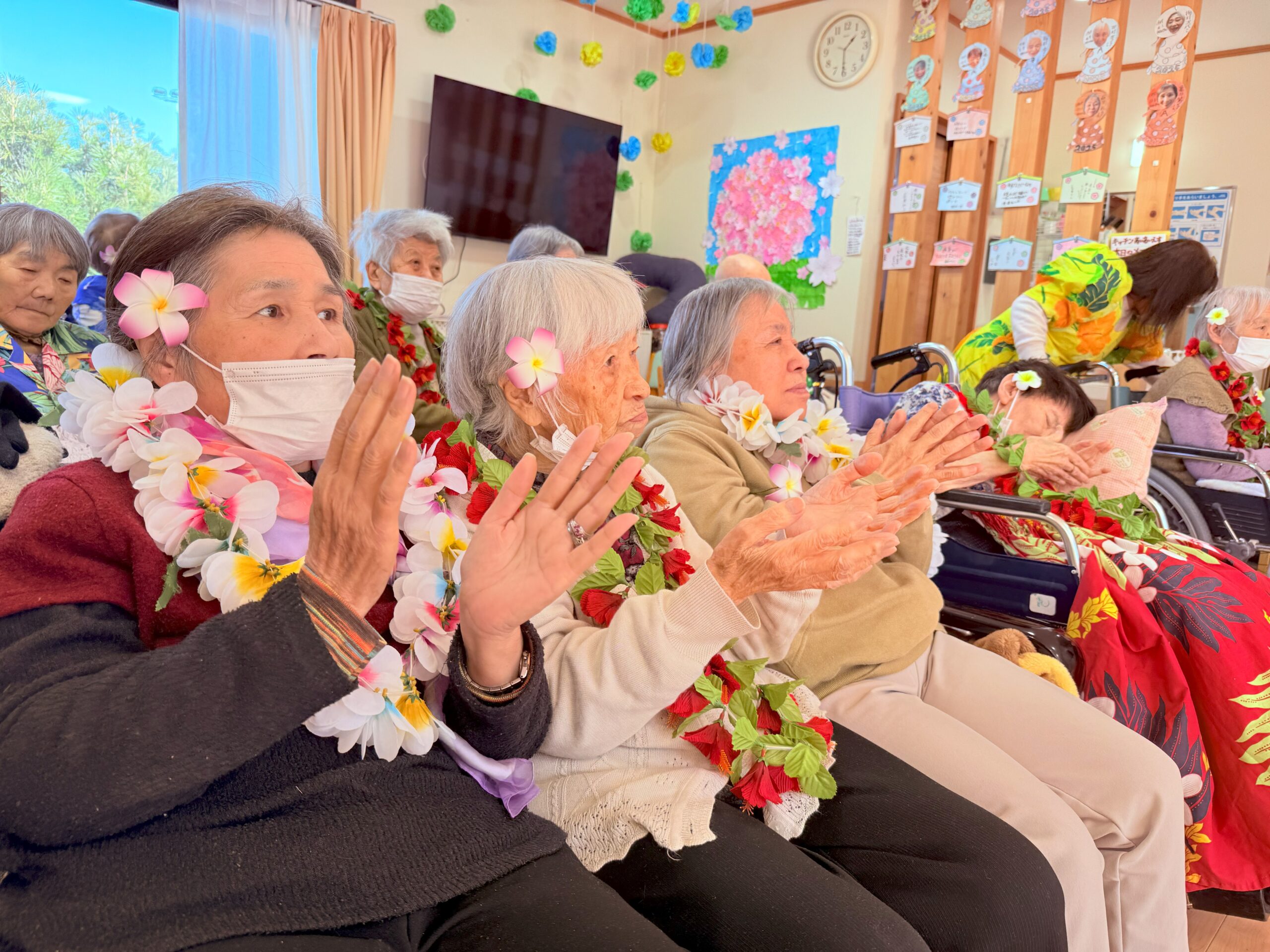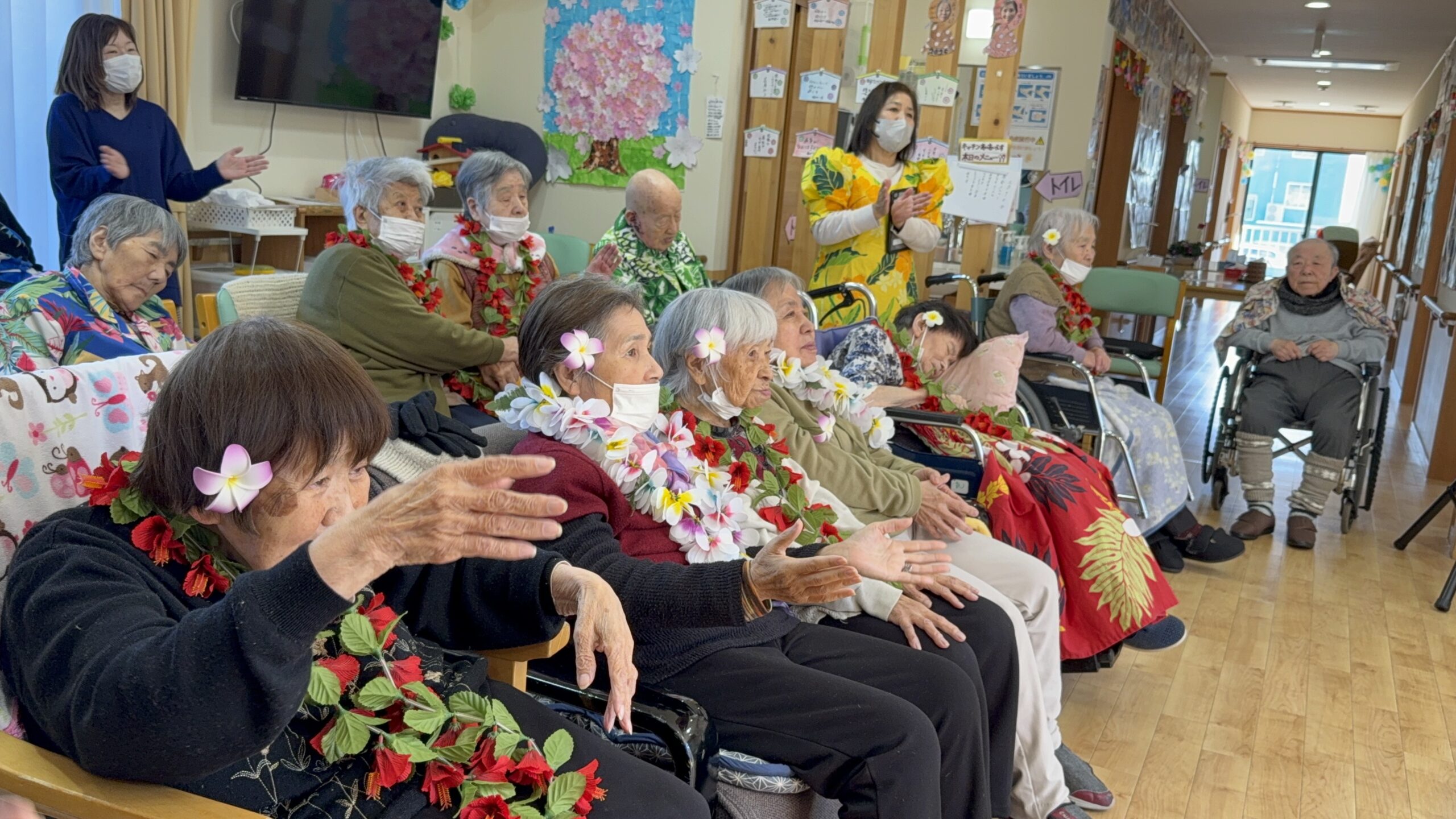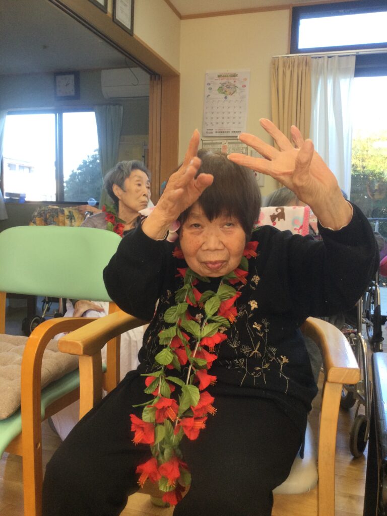 フラダンス2025(グループホーム あいあいえす) 公開日 : 2025年5月26日 / 更新日 : 2025年5月23日 グループホーム、認知症デイ ブログ 少し前になりますが、フラダンスの日でした。いつものようにレイや花飾りをつけ、先生に振り付けを教わります。踊りが苦手な方も、ウクレレ生演奏の歌を聴きながら素敵な表情です♪フラダンスの振り付けはリハビリにも良いらしく、日中のリハビリ時間にも取り入れ予定です! タグ : ウクレレ, フラダンス, リハビリ, 群馬, 高崎 「みんなで作りました(グループホーム 群馬町)」 「今年もいちご狩りへ!その2(小規模多機能の家 大利根前橋)」