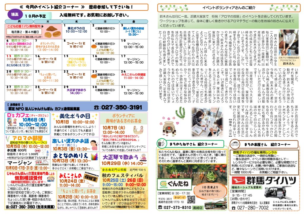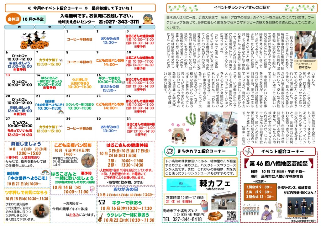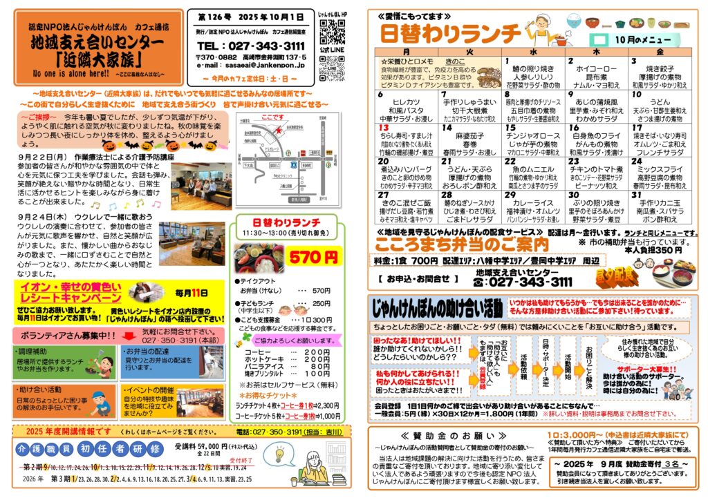 カフェ通信10月号ができました!時々吹く風が少し冷たく感じるようになってきました。と思いきや、まだまだ半袖が必要だったり…寒暖差がありますのでみなさん体調にお気を付けくださいね。