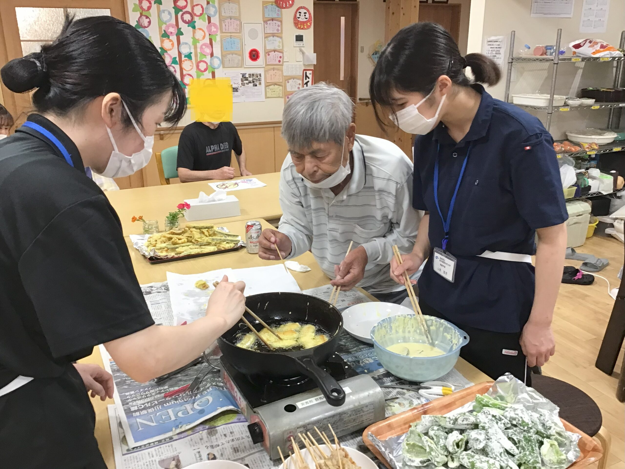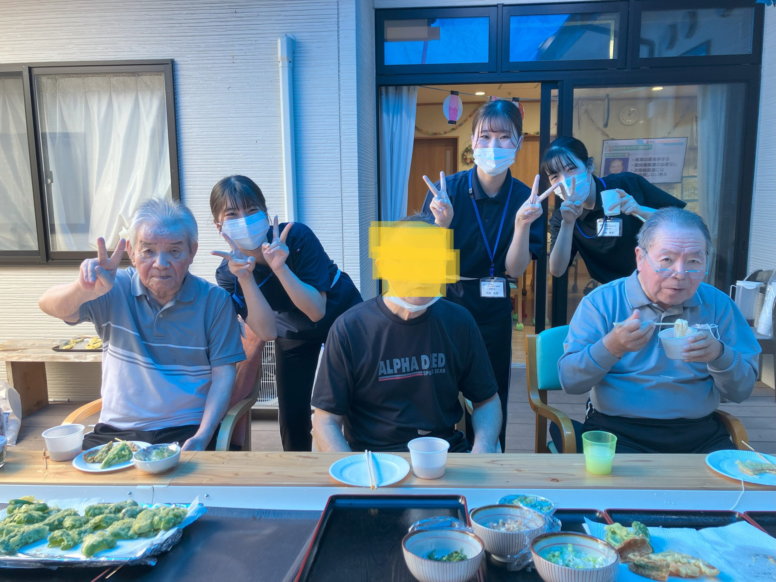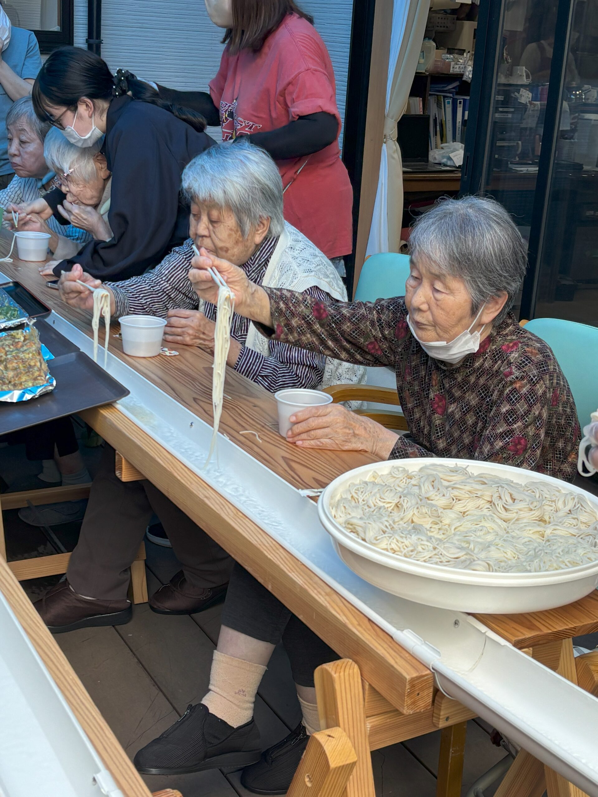午前中から天ぷらを揚げ、昼食は、中庭で流しそうめんです!みなさん、揚げたての天ぷらと一緒にたくさん召し上がっていました。
