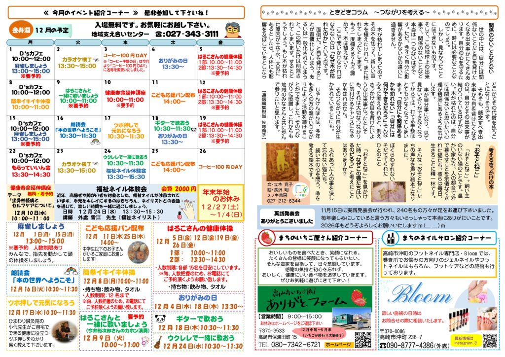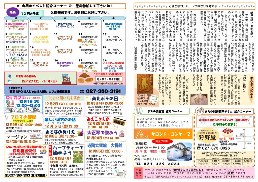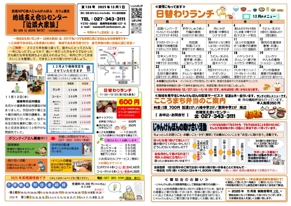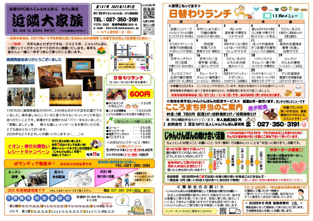 カフェ通信12月号です!今年もあと少しとなりました。体調にお気を付けて年末年始お過ごしください。じゃんけんぽん近隣大家族のお休みは12月27日(土)~1月4日(日)です。2026年は1月5日(月)からスタートします。