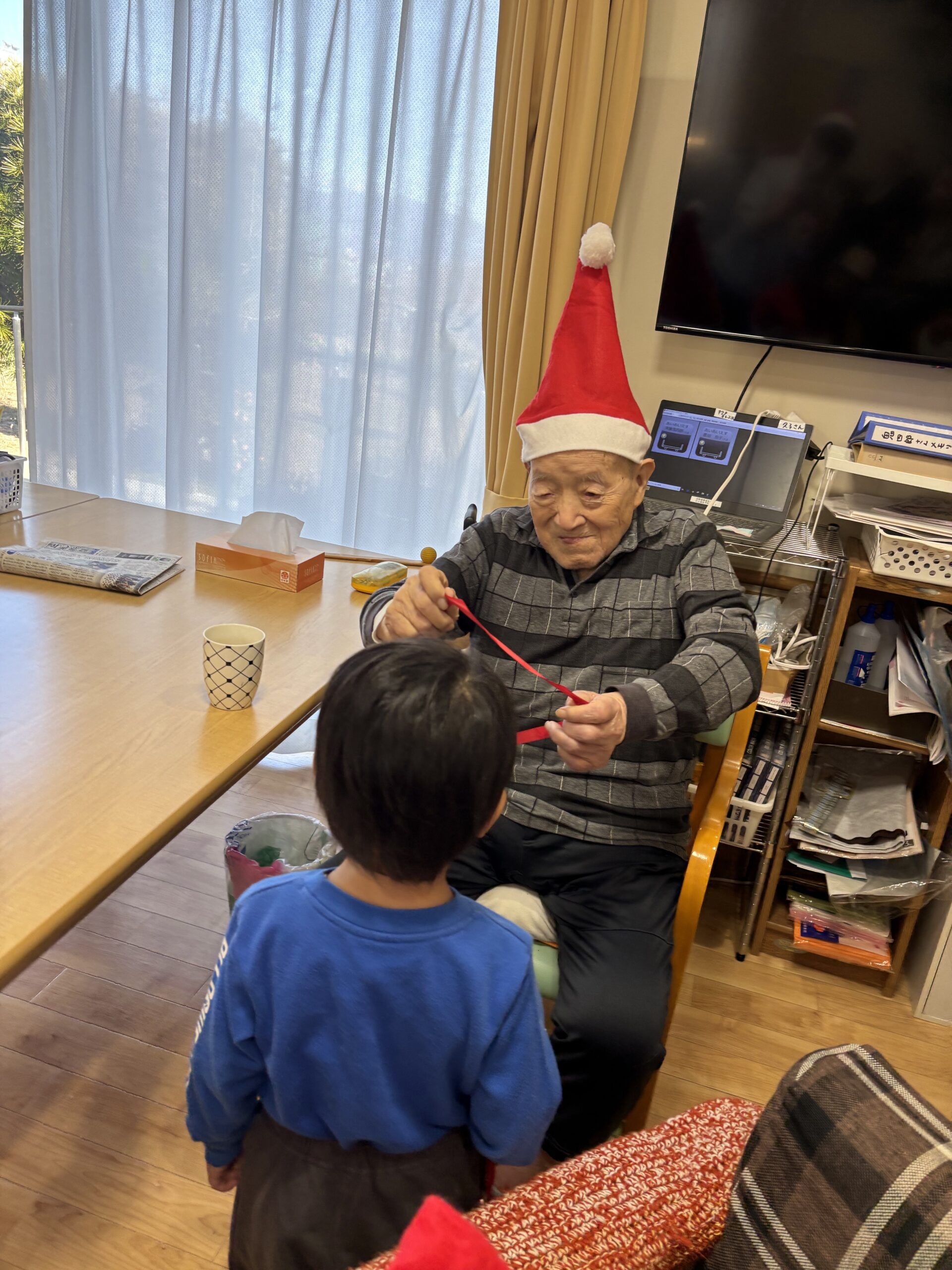 またクリスマスプレゼントに毛糸で作ったサンタクロースとメダルを用意し利用者さんから子供たちに渡してもらいました。